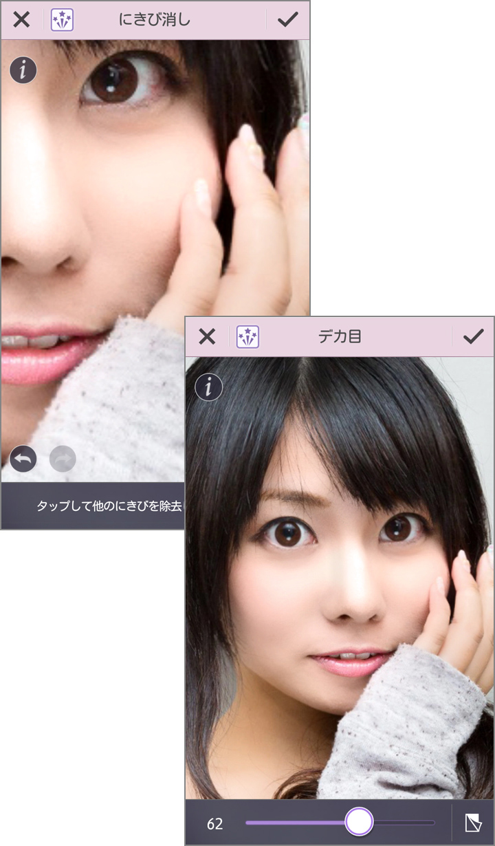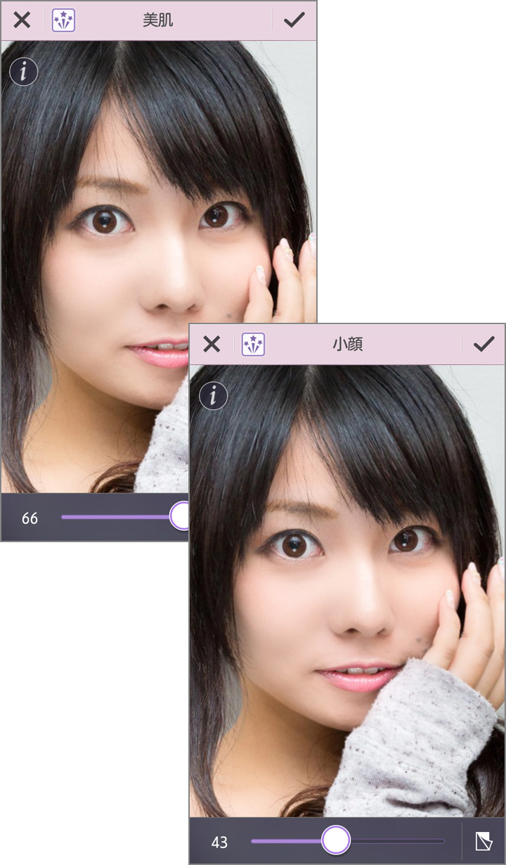 どの効果もやりすぎると不自然なので、スライダーを使ってうまく調整してくださいね。調整ができたら画面右上のチェックボタンをタップして確定すると、編集画面に戻ります。