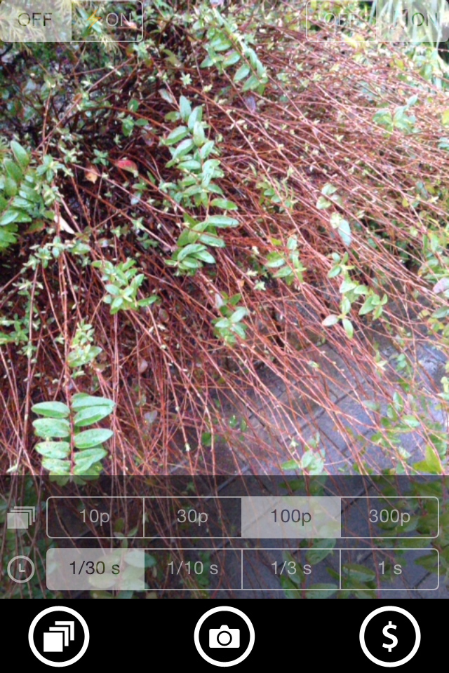 アプリを起動すると、すぐに撮影画面が表示されます。画面左上でフラッシュのON/OFF、画面右上でシャッター音のON/OFFができます。画面下部には撮影枚数や撮影速度を設定するボタンがあります。