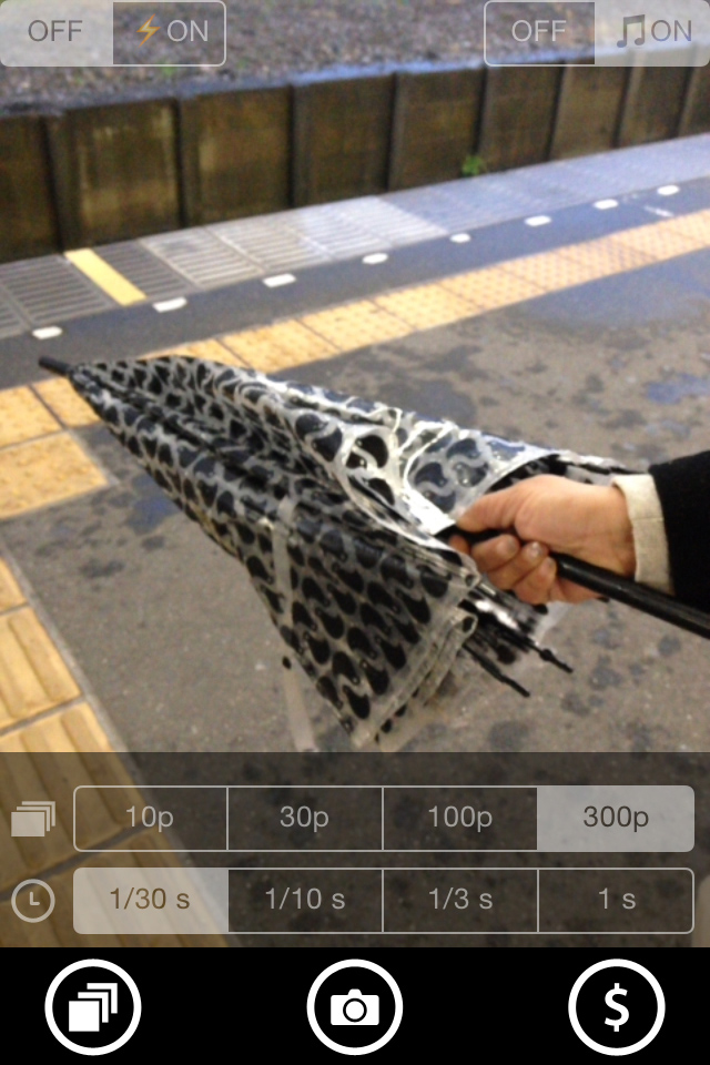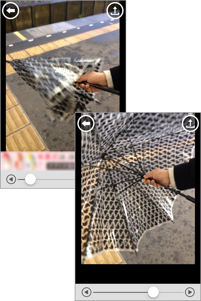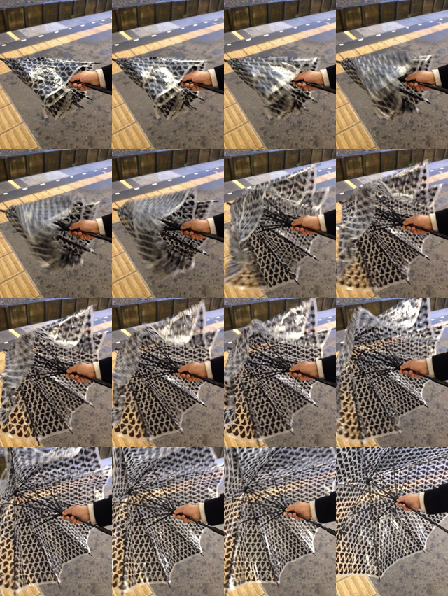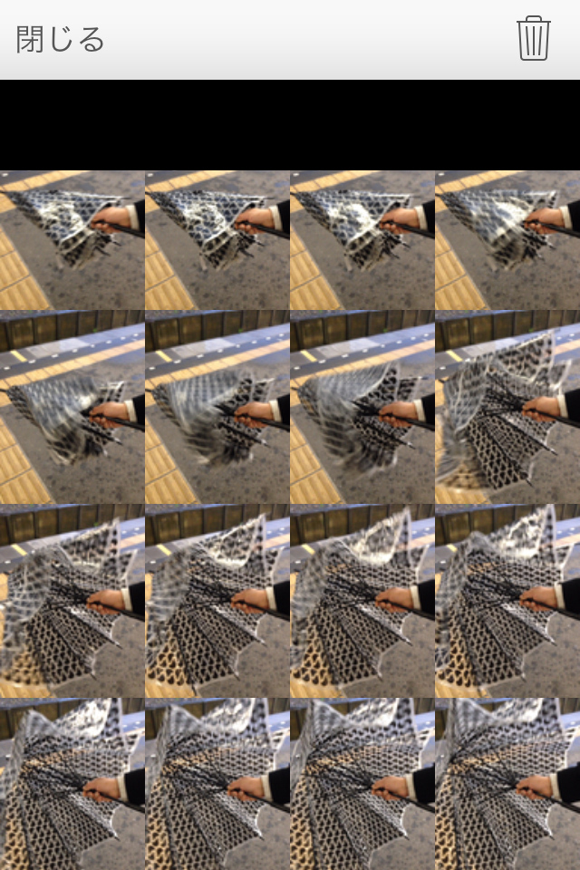 画面下部中央のカメラボタンをタップすると撮影スタート。設定した撮影枚数分のシャッターが切られると、自動で止まり、撮影した写真の一覧が表示されます。傘を開く瞬間を撮影してみました。ほんの1、2秒の出来事ですが、閉じた傘が開かれるまでの瞬間を逃さず撮影できました。