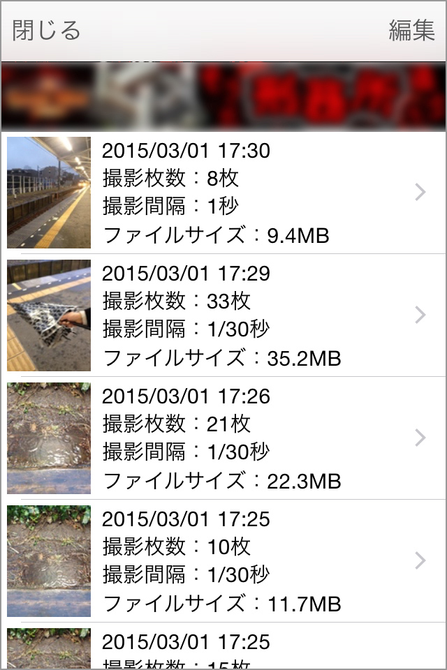 これまでに撮影した写真は、カメラ画面の左下のギャラリーボタンをタップすることで、リストを見ることができます。撮影時刻・撮影枚数・撮影間隔・ファイルサイズが表示されます。一度に多くの写真を撮るため、容量を大量に消費しますので、残容量に気をつけましょう。