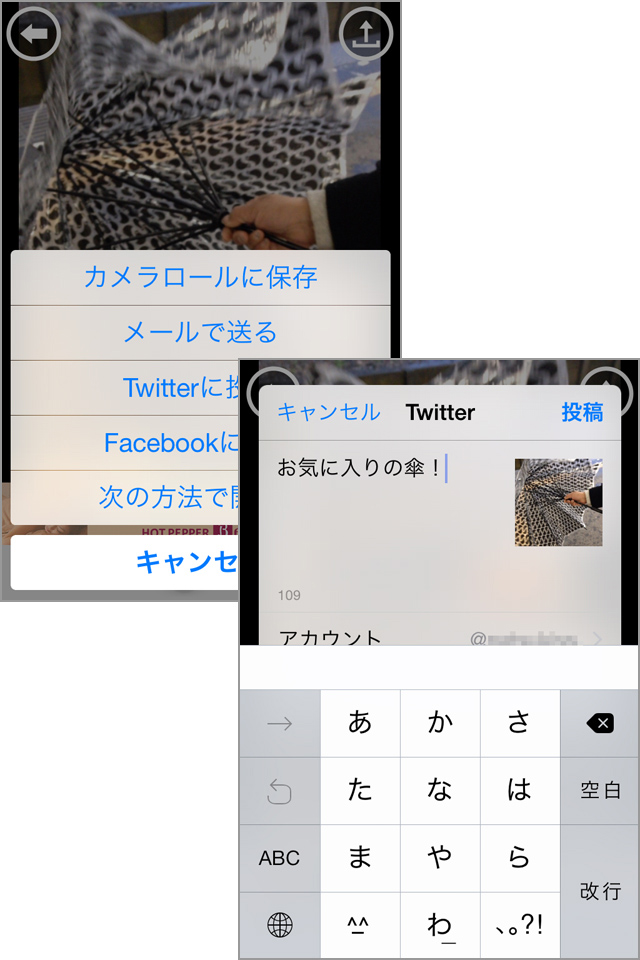 撮影した写真を確認して、気に入った写真はスマートフォンに保存したり、SNSで共有しましょう。画面右上の保存ボタンをタップすると、 [カメラロールに保存・メールで送る・Twitterに投稿・Facebookに投稿・次の方法で開く] のメニューが表示されます。決定的瞬間が撮れたら、ぜひ共有してくださいね!