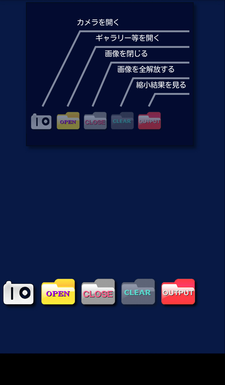 縮小が完了すると、できあがった画像を表示する縮小結果表示画面が表示されます。結果の画面は、メニュー画面の[OUTPUT]ボタンをタップで、いつでも見ることができます。