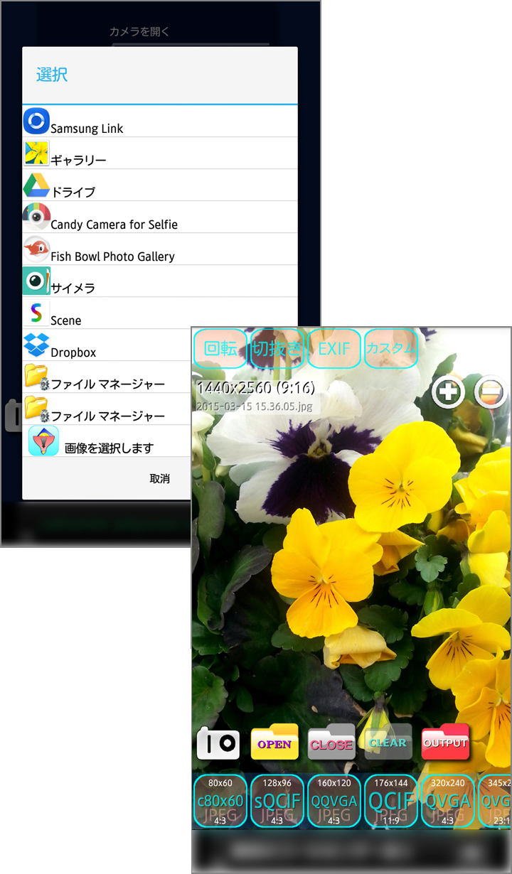 画面下のサイズ選択アイコンをタップすると、画像を縮小することができます。指で左にスワイプすると、隠れているサイズも表示されます。縮小サイズのアイコンは、80x60・128x96・QQVGA(160x120)・QVGA(320x240)・QVGA+(345x240)・WQVGA+(427x240)・VGA(640x480)・WVGA(800x480)・SVGA(800x600)・XGA(1024x768)が基本表示サイズです。