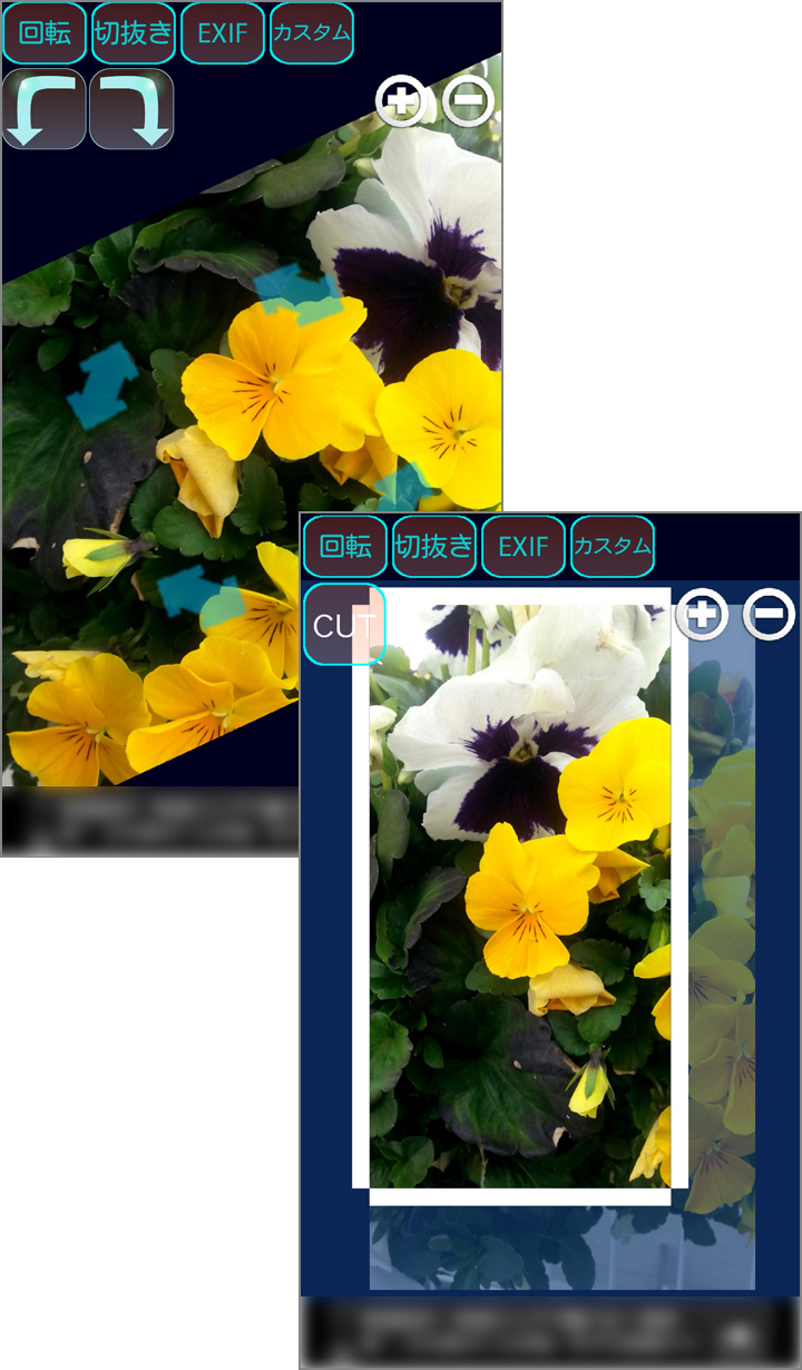 切り抜きを行うには、画面上部の[切抜き]ボタンをタップします。切り抜きモードに入りますので、4つの白いバーを移動することで、切り抜き位置を修正します。画面左上の[CUT]ボタンを押すことで切り抜きます。切り抜いた画像は、元画像とは別の画像として読み込んだ状態になります。