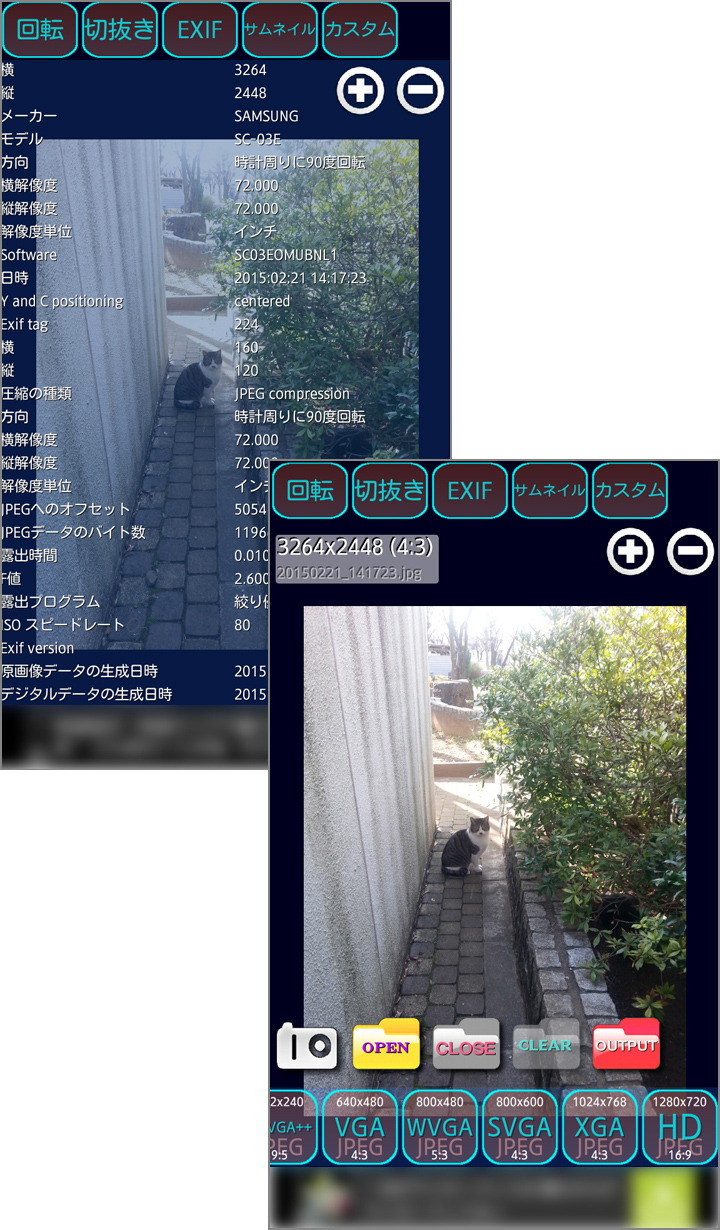 画像にExif情報(カメラの設定や撮影日時に関する情報など)が埋め込まれている場合、画面上にExifボタンが表示されます。このExifをタッチすることで、画像のExif情報を閲覧できます。GPS情報も同様に埋め込まれている場合、画面上にGPSボタンが表示されています。このGPSをタッチすることで、地図ソフトで埋め込まれている位置を表示します。これらのExif情報は縮小処理を行う際に、削除されます。