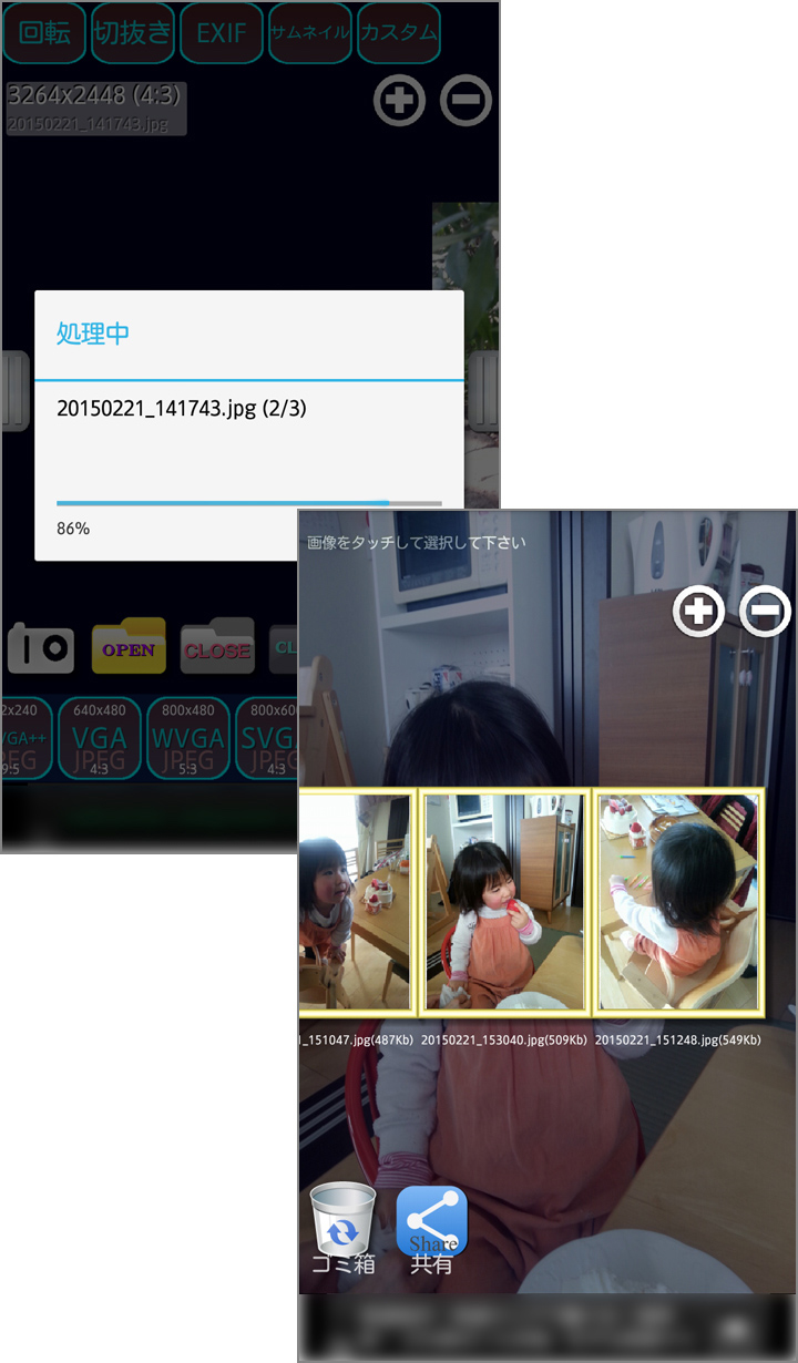 縮小サイズを決めてアイコンをタッチすると、縮小が始まります。元画像のサイズと出力サイズのアスペクト比は、一致するように出力します。例えば、1680x1050の画像を[VGA(640x480)]ボタンをタップして出力すると、640x400に縮小します。