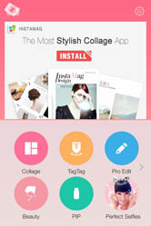 複数の写真を1枚の画像にまとめることのできる[Collage]、写真にタグやステッカーを追加できる[TagTag]、色調補正・照明、フィルターなどの編集機能[Pro Edit]、美肌や小顔など人物写真に適した[Beauty]、写真内の小さな画面に写真の一部を映し出す[PIP]、個性的なテンプレートを選べる[InstaMag]、パスワード付きのフォルダで写真を守れる[Secret Album]といった7つの機能で、写真を思う存分加工することができます。