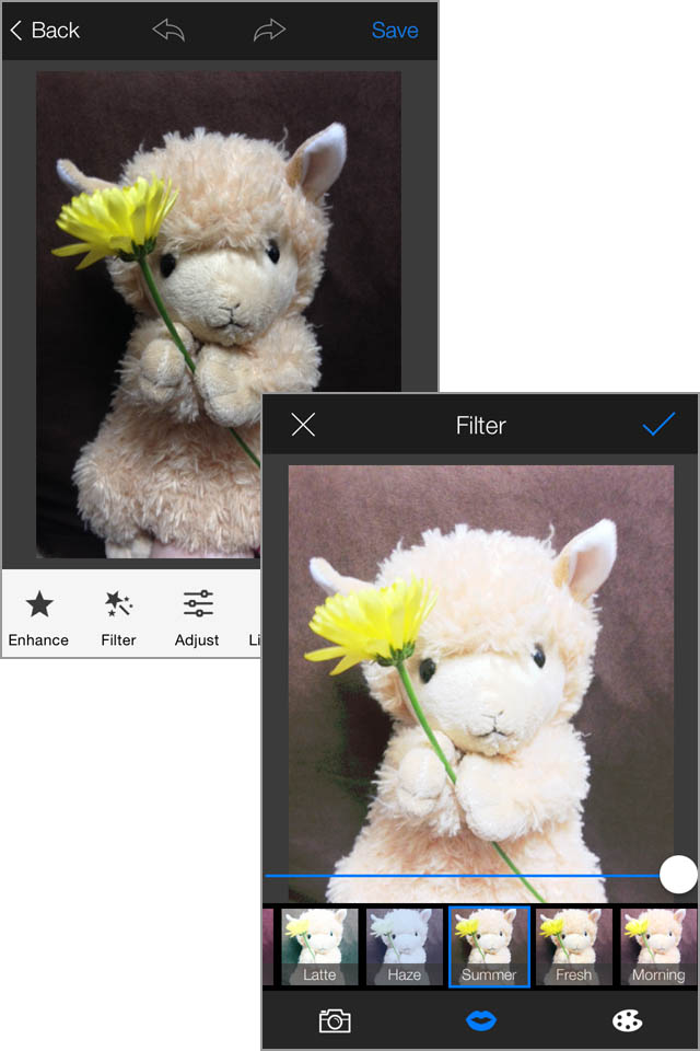 このアプリでは撮影→色調補正→切り抜き→フィルター加工→光効果→ぼかし→文字入れ→ステッカー→フレーム→コラージュ、といった加工を次々と行うことができ、とてもスムーズに一連の加工作業ができます。加工が完了したら、画面右上の[Save]をタップすると、スマートフォンへの保存とFacebookなどのSNSへの共有メニューが表示されます。