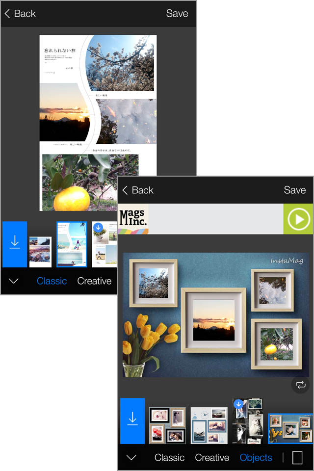 コラージュ機能も「FotoRus」のおすすめポイント。複数の写真を1枚の画像にまとめることのできる[Collage]と、個性的なテンプレートを選べる[InstaMag]で、コラージュ写真が作れます。