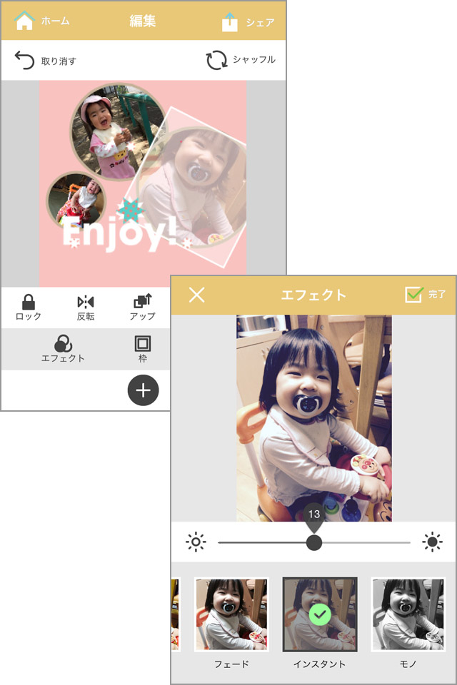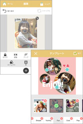 アイテムをタップすると、編集メニューが表示されます。ロック(アイテムを固定)・反転・アップ(重なったアイテムを前面に)・ダウン(重なったアイテムを背面に)・削除ができます。写真の場合は、エフェクト加工できる[エフェクト]、写真の枠を変更する[枠]、写真を切り抜く[切り抜き]のメニューも用意されています。