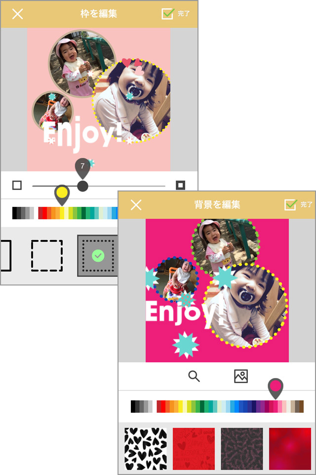 テンプレートそのままでもかわいいコラージュですが、さらに好みのテイストに編集することもできます。モーションスタンプや写真などのアイテムの位置を変えたり、ピンチイン・ピンチアウトで拡大・縮小したり、自由に変更できます。