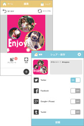 編集が終わったら、画面右上の[シェア]をタップしましょう。[シェア・保存]画面が表示されます。シェア・保存のメニューには、フォトファイブラリに保存・LINEで送る・Instagram・その他アプリへ共有・Eメールで送る・Twitter・Facebook・Google+(Picasa)・Tumblrがあり、画面上部にコメントを入力してかんたんに投稿することができます。
