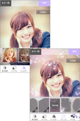 [フィルター]をタップすると、選ぶだけで雰囲気のある写真に変えることのできるフィルターが40種類以上用意されています。[Sepia][Mono][Lomo]といった定番のレトロ風フィルターはもちろん、薄いピンクがかわいい[PinkRose]、ほんのり黄色くなる[Lemonade]など、かわいいフィルターがたくさん揃っています。画面下部のサムネイルをタップすると、フィルターを選ぶことができます。