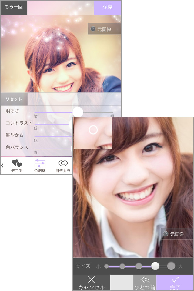 編集中に元の写真と比較したいときは、画面右上の[元画像]ボタンをタッチしてみてください。タッチしている間だけ加工前の写真が表示されます。