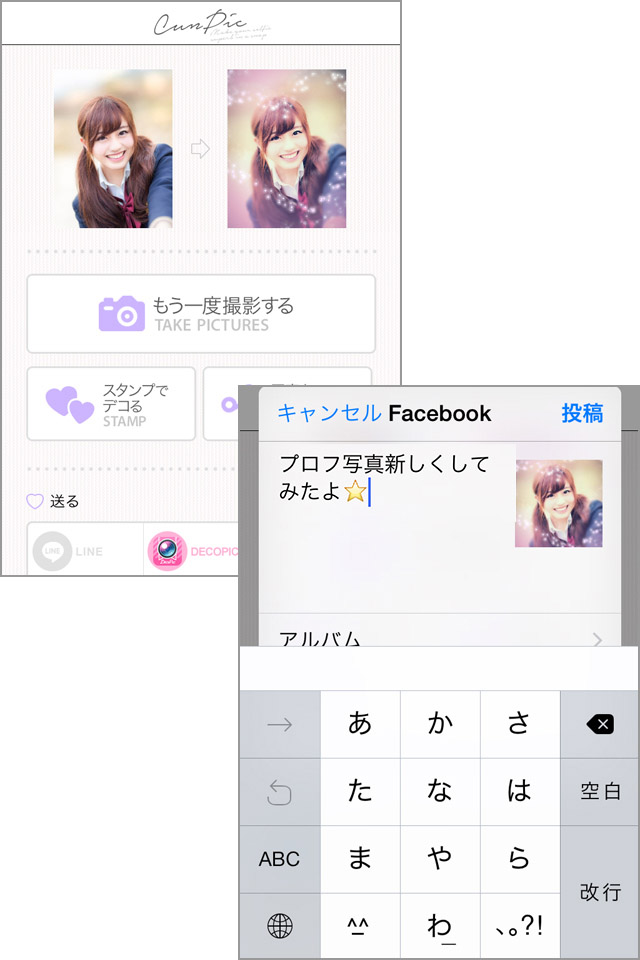 [送る]メニューでは、LINE・DECOPIC・Instagram・Twitter・Facebook・WhatsApp・mixiなどのSNSアプリや加工アプリに直接共有することができます。「CunPic」で綺麗になったあなたの写真をみんなに自慢しちゃいましょう。