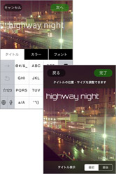 タイトルを入力し、カラーやフォントを選んで画面右上の[次へ]をタップすると、タイトルの位置・サイズを調整する画面が表示されます。タイトルは動画の最初か最後に追加できます。英字フォントは豊富に用意されていますし、日本語に対応したかわいいフォントもあるのが嬉しいですね。
