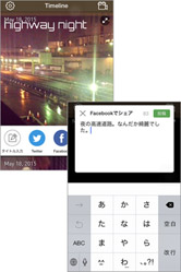 あらかじめ[Timeline]画面左上の設定ボタンをタップしてTwitterやFacebookと連携しておくことで、メニューボタンの[Facebook]ボタンをタップしてコメントを入力するだけで、簡単に投稿できます。お気に入りの動画ができたらSNSで共有しましょう!(著作権のある曲をBGMに使うときは注意してくださいね)