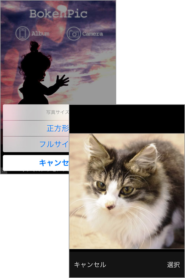 [Album]を選んだ場合、[正方形]をタップすると写真のトリミング画面が表示され、[フルサイズ]をタップするとそのまま編集画面に選んだ写真が表示されます。