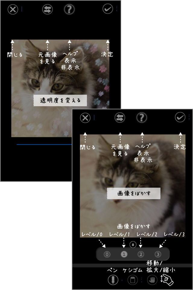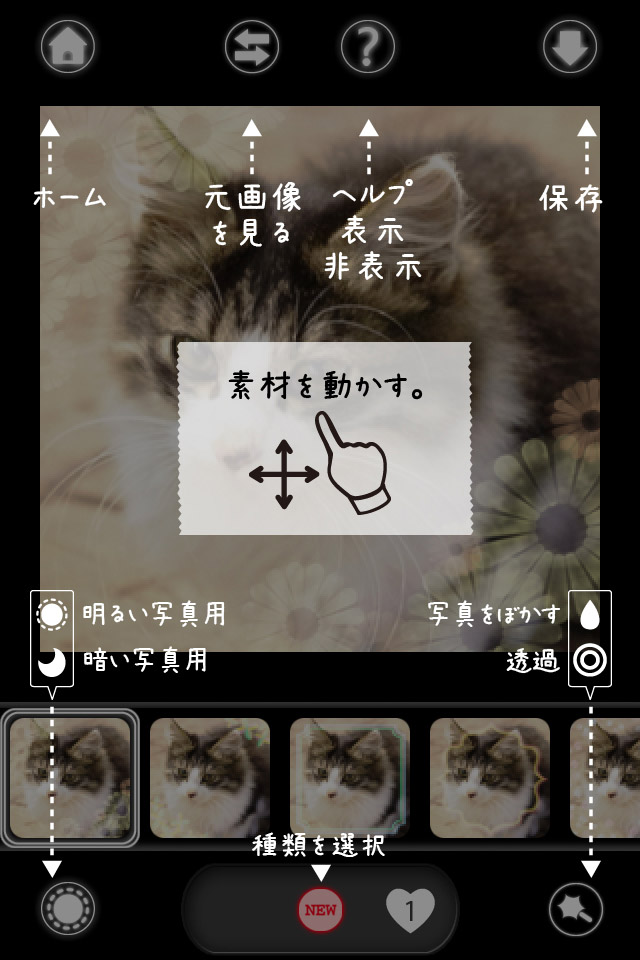 加工する写真を用意すると、編集画面が表示されます。初回起動時は編集画面に使い方が表示されます。説明を読んで使い方を確認しましょう。この表示は画面上部の[?]ボタンをタップすることで、表示・非表示を切り替えることができます。