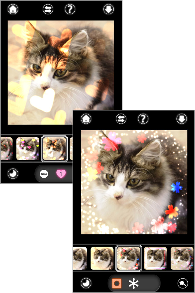 光のボケ効果を写真に加えるには、写真の下に表示されているサムネイルをタップしましょう。写真に光ボケ効果のフィルターが適用されて、キラキラ効果を簡単に加えることができます。元画像との違いを確認するときは画面上部の左右の矢印ボタンをタップすると、元画像が表示されます。