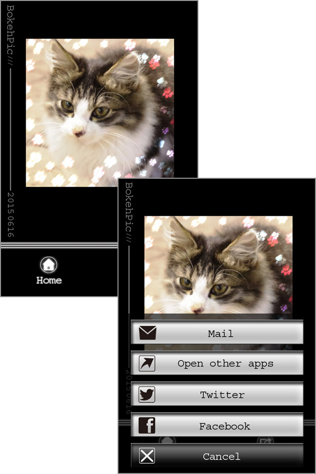 [Share]ボタンを押すと、画像をメールで送る[Mail]、他のアプリを開く[Open other apps]、Twitterに投稿する[Twitter]、Facebookに投稿する[Facebook]ボタンが表示されます。素敵な写真ができたら、家族やお友だちに写真を送ったり、SNSに投稿して写真センスをアピールしちゃいましょう!