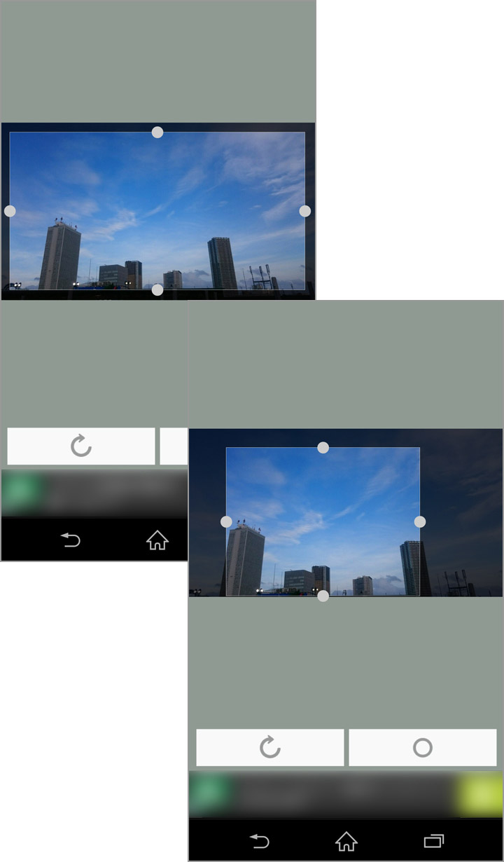 今回は、空の下のビル街の写真を選んでみました。白い点の部分をタッチしながら動かすと、使いたい部分を好きな位置・大きさで選択することができます。画面左下の[回転]ボタンをタップすると、写真を回転させることができます。選択が終わったら、画面右下の[○]ボタンをタップしましょう。