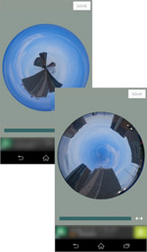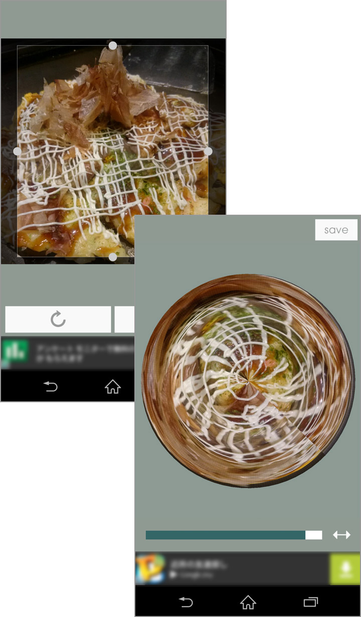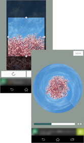 写真を選んで[○]ボタンをタップすると、自動的に球体のように加工され、惑星のような写真ができあがります!写真がゆっくりと回転する様子が美しいプレビュー画面です。画面下のバーを左右に動かすと、写真の加工の具合を変更することができます。スライダーを左に動かすと、中心に吸い込まれていくように収束します。右に動かすと、中心から外側に膨らみます。