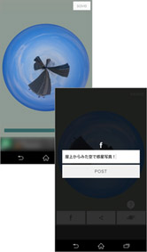 画面右上の[save]をタップすると写真が保存され、共有画面が表示されます。Facebookに共有できる[f]ボタン、その他シェアできるアプリ一覧を表示する[共有]ボタン、「プラネットカメラ」の[GALLERY]に投稿できるボタンが表示されます。[f]をタップすると、コメントを入れるだけで簡単にFacebookへ投稿することができます(Facebookにログインしている場合)。素敵な写真ができたら自慢しちゃいましょう!