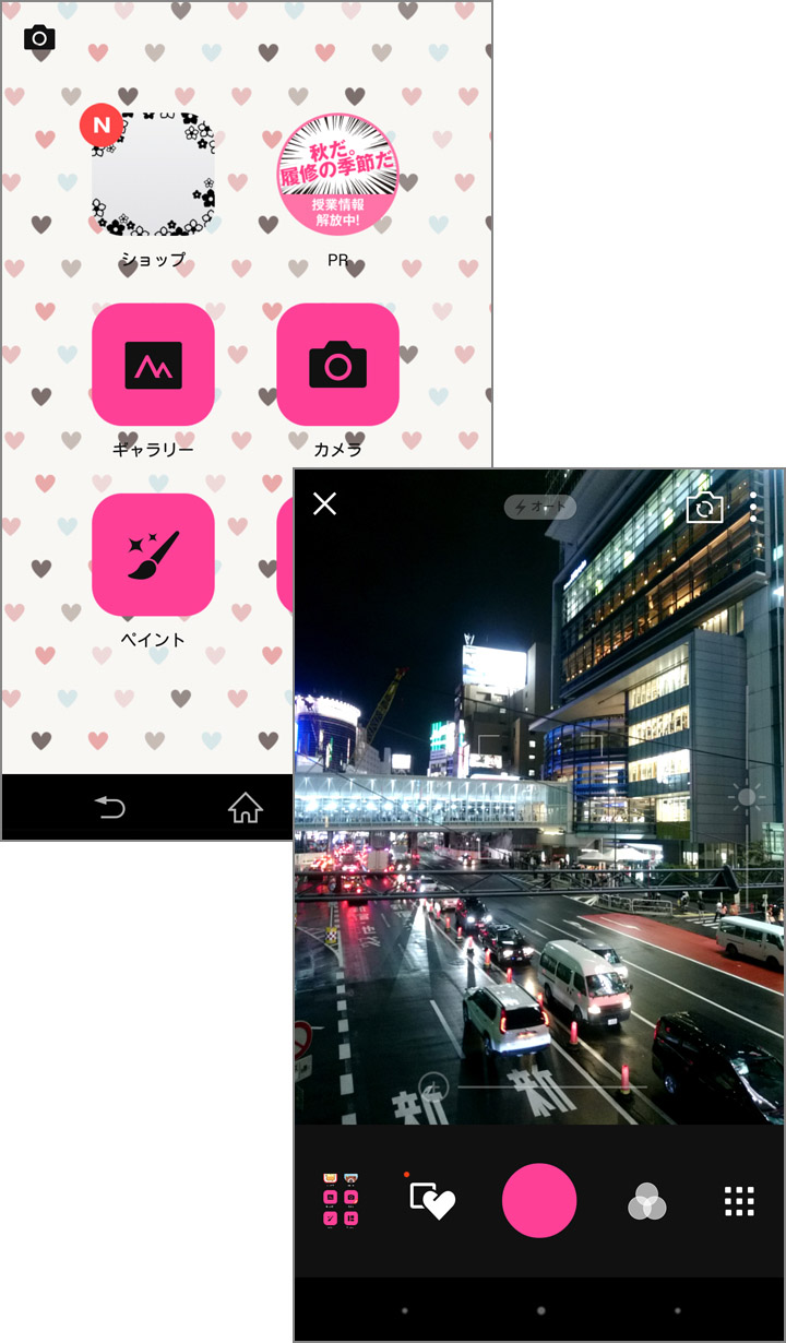 メニューは、メイン機能である[カメラ]、スマートフォンに保存されている画像を確認・選択できる[ギャラリー]、キャンバスに手書き文字やスタンプ[ペイント]、写真を組み合わせることのできる[コラージュ]、フレームやスタンプを購入できる[ショップ]があります。