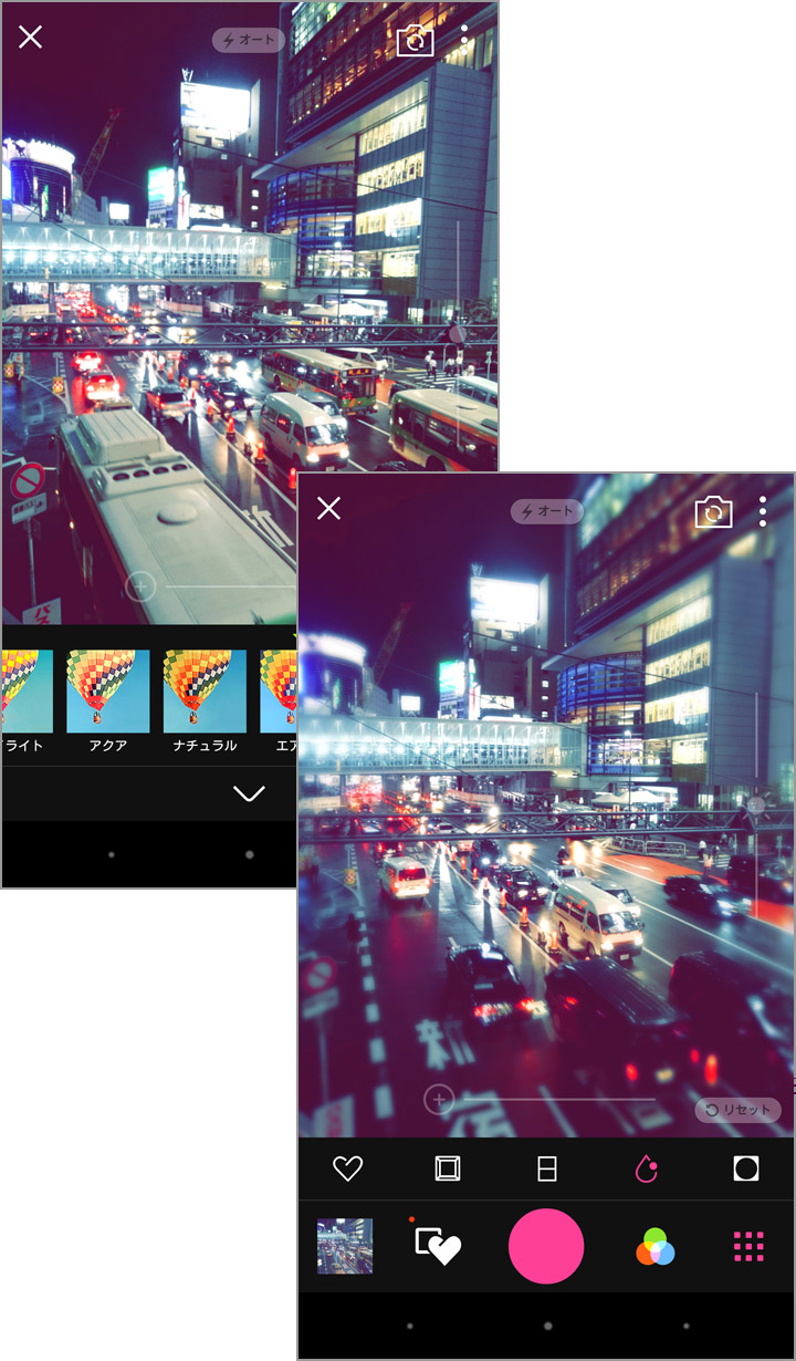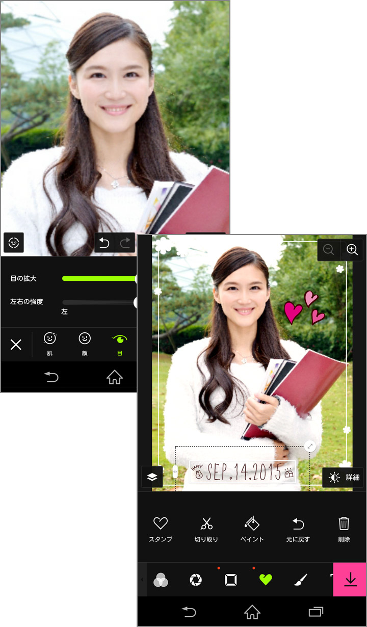 写真の撮影・加工が終わったら、画面右下に表示される[↓]ボタンをタップすると保存が完了し、[共有]画面が表示されます。[共有]画面では、加工前・加工後の写真が並んで表示されるので、どのように変わったか見比べることができるのが楽しいですね。