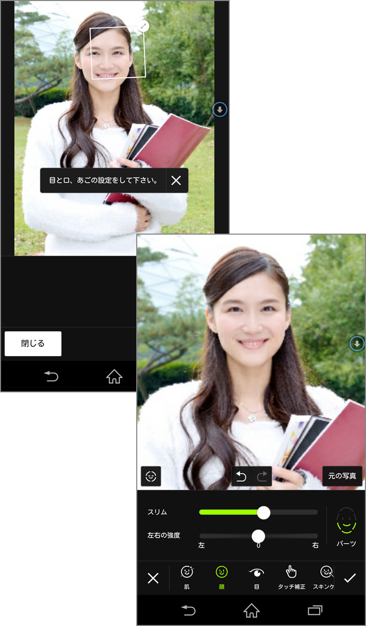 それではビューティー機能を駆使して、より美しい写真にしてみましょう。[肌]メニューをタップすると、自動で肌が明るくなめらかに補正されます。[明るさ][なめらかさ]のスライダーを左右に動かすことで補正の強さを調整することもできます。次に、[顔]メニューで顔をスリムにしてみましょう。[スリム]スライダーを少しずつ右に動かすと顔の幅が狭まり、細面になりました。[目]メニューも同様で、[目を拡大]のスライダーを右に動かすと目が大きくなります。不自然にならないように少しずつ加工するのがポイントです。
