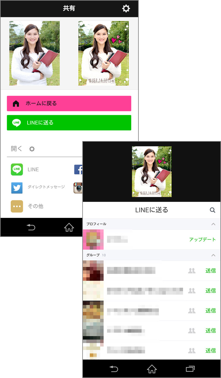 「aillis」は「LINE」の公式カメラアプリなので、「LINE」への共有が簡単にできます。[LINEに送る]ボタンをタップすると、自分のプロフィールへの登録(アップデート)と、グループや友達の連絡先一覧が表示されます。[送信]ボタンをタップするだけで簡単に「LINE」で共有することができます。Facebook、Twitter(ダイレクトメッセージ・ツイート)、Instagram、その他のアプリへの共有も簡単です。
