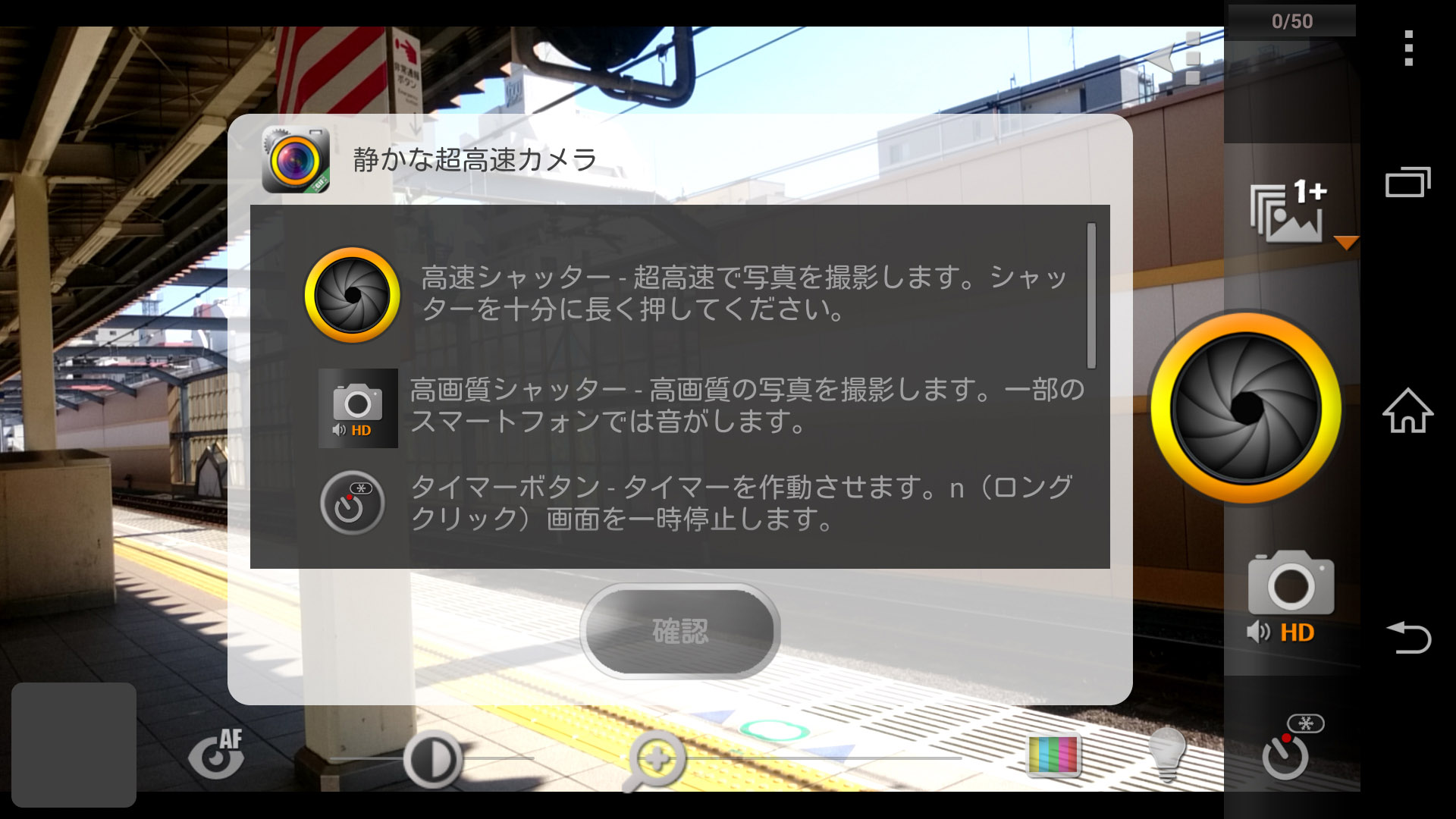 アプリを起動すると、撮影画面が表示されます。画面右側中央に表示されている黄色い円のボタンが[高速シャッター]です。長押しすると、高速連写ができます。その下のボタンが[高画質シャッター]です。高画質で1枚ずつ撮影できます。[タイマーボタン]をタップすると、タイマーを作動させることができます。