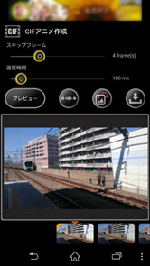 撮影後の画面で[GIF]ボタンをタップすると、高速連写した一連の写真からGIFアニメを作成することができます。[GIFアニメ作成]画面では、スキップフレーム(0frame~10frames)、遅延時間(10ms~1000ms)を調整することで、GIFアニメに使う写真の枚数や速度を変えることができます。