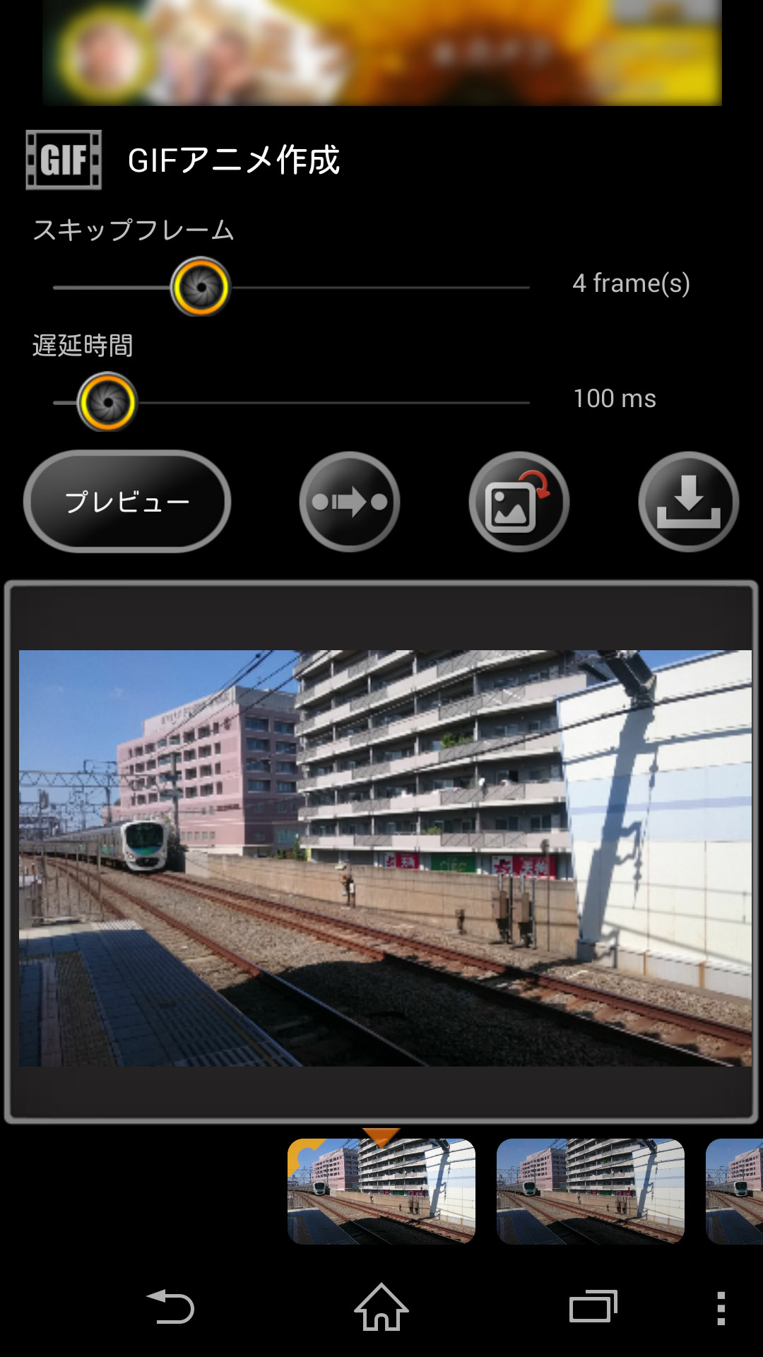 [プレビュー] ボタンをタップすると動く様子を確認できます。逆再生や画面の回転もボタンをタップするだけで設定できます。保存ボタンをタップすると作成したGIFアニメが保存されます。
