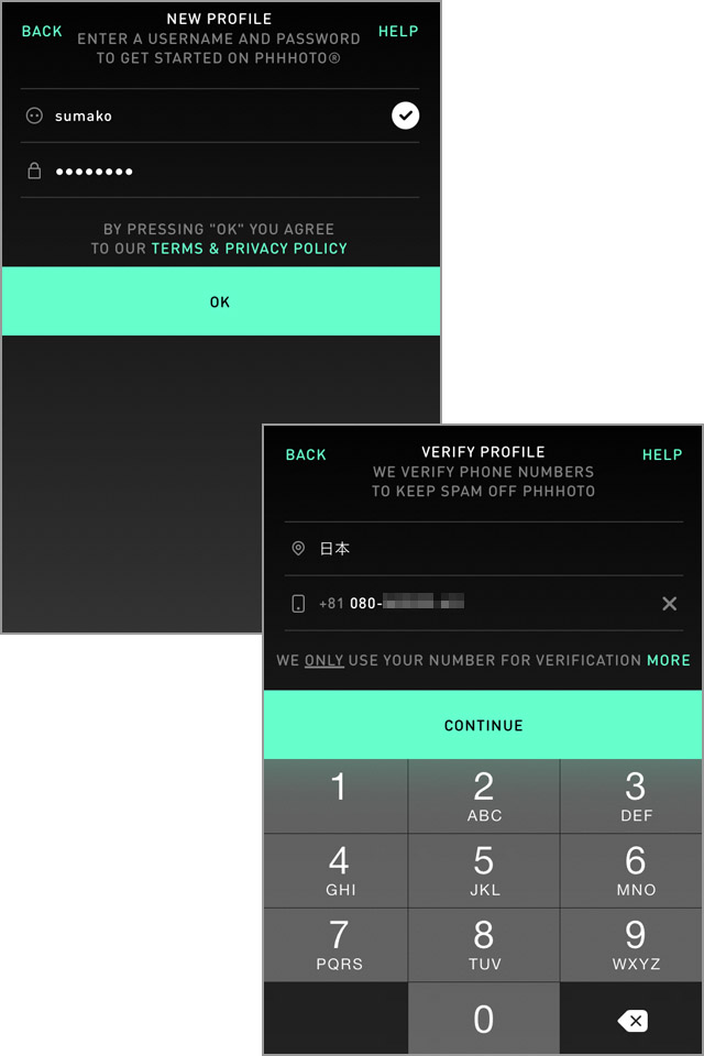 アプリを起動すると、最初に[NEW PROFILE][SIGN IN]というボタンが表示されます。このアプリを使うためにはアカウント設定が必須なので[NEW PROFILE]をタップして進みましょう。次の画面では、ユーザーネームとパスワードを入力し、[OK]をタップします。