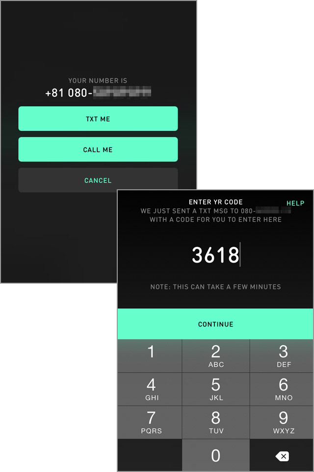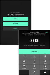続いて、少し手間がかかる電話番号を使った認証があります。画面に電話番号を入力するのですが、+81と電話番号の入力箇所の前に表示されています。これは日本の国番号なので気にせずそのまま電話番号を入力して[CONTINUE]をタップします。次の画面では、[TXT ME][CALL ME]というボタンが表示されます。SMSで認証コードを受け取りたい場合は[TXT ME]を、電話音声認証コードを確認したい場合は[CALL ME]をタップしてください。