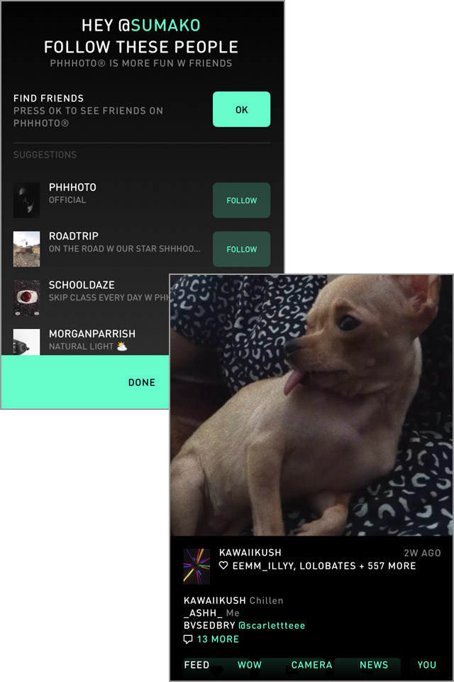 アカウント設定が終わると、他のユーザーのフォローを促す画面が表示されます。アプリがおすすめしてくれるユーザをフォローしたり、電話帳やTwitter、Facebookと連携することで「PHHHOTO」を使っている友達を探してフォローすることもできます。