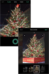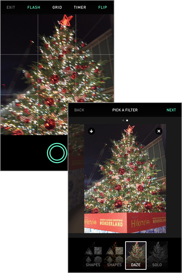 画面中央の◎ボタンをタップすると、5枚の連続写真を撮影し、その画像からGIFアニメが自動的に作られます。撮影完了後、自動で[PICK A FILTER]の画面が表示されます。☆形で切り抜かれる[SHAPES]や、フルカラーで少しぼかしのかかった[DAZE]、モノクロの[SOLO]などのフィルターが用意されています。好きなフィルターを選んで画面右上の[NEXT]をタップしましょう。画像左上の[↓]ボタンをタップすると、その場でスマートフォン本体に保存することもできます。