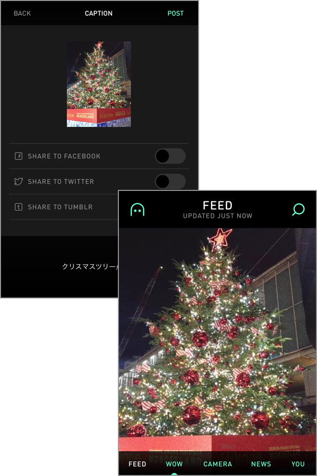 次に、共有先を選んで、画像にキャプションを付ける画面が表示されます。「PHHHOTO」のFEED画面への投稿と同時に、[SHARE TO FACEBOOK][SHARE TO TWITTER][SHARE TO TUMBLR]のボタンをONにすることで、Facebook・Twitter・Tumblrにも共有することができます。