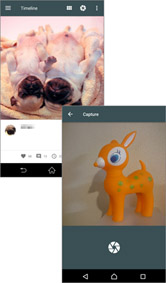 今回はAndroid版で解説しますね。アプリを起動すると、[Timeline]が表示されます。写真を公開しているユーザーの写真が新着順に表示されます。スマートフォンを傾けると写真がグリグリ動いて見えることにお気づきでしょうか?「Seene」を使って撮影すると、このような3D写真を簡単に撮影することができます。
