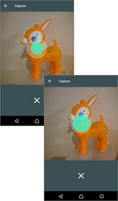 撮影が始まると、被写体を囲むように黄色い点が多数表示されます。同時に、画面中央に緑色の円と半透明の円が表示されます。被写体の周りを囲むように、スマートフォンをゆっくりと動かすと、緑色の円が大きくなります。緑色の円が半透明の円と同じ大きさになり、表示が消えたら撮影終了です。文章だと説明が難しいのですが、初回起動時にはチュートリアルもあり、操作をしてコツを掴めばすぐ慣れますので安心してください。