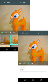 左から二番目のボタンをタップすると、焦点(ぼかし)の調整ができます。スライダーを左右に動かして焦点やぼかしの範囲を調整してください。左から三番目のボタンは、キャプションの入力です。撮影した写真についてのキャプションを入力しましょう。