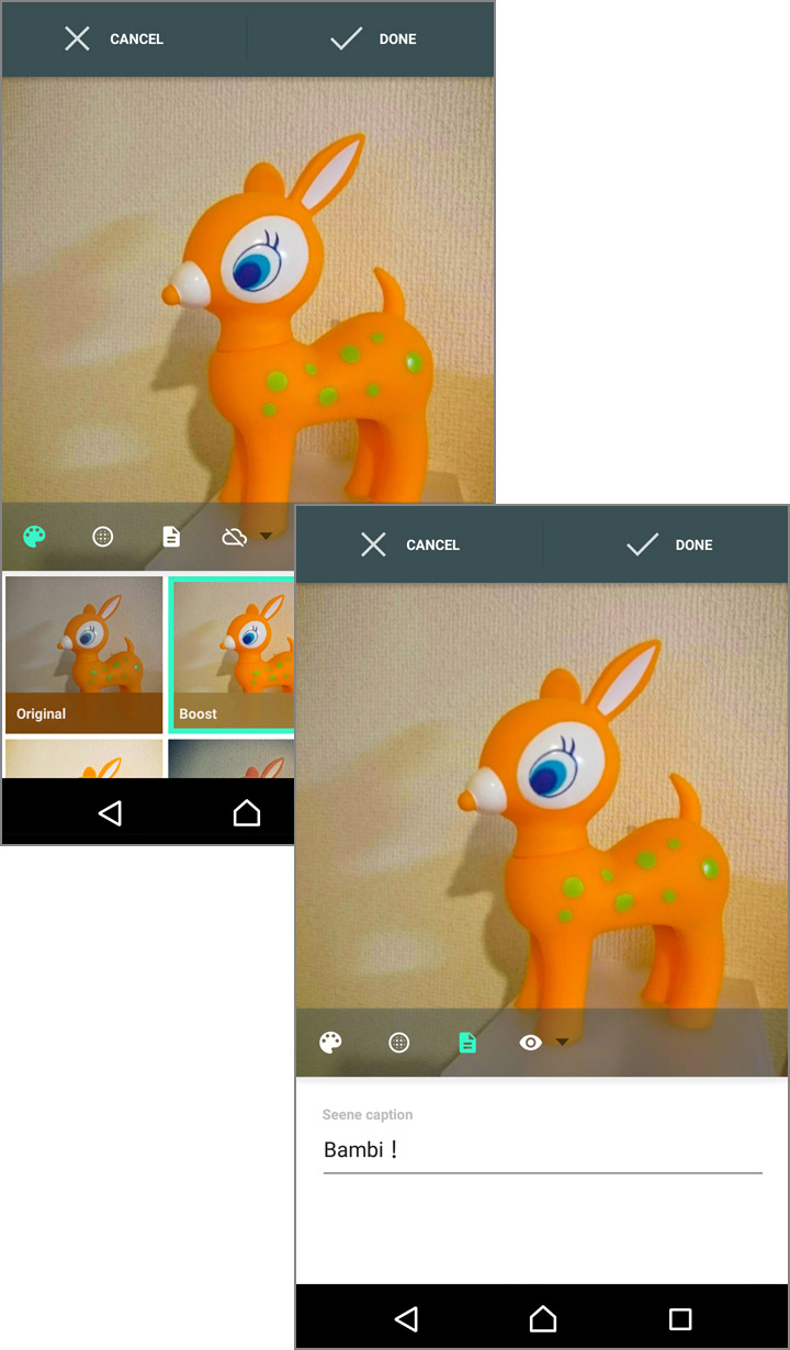 撮影後は、フィルター・焦点(ぼかし)の調整・キャプションの入力・公開範囲の設定ができます。写真下部のメニューボタン一番左のパレットボタンをタップするとフィルターの選択画面が表示されます。フィルターは全部で10種類。フィルター無しと合わせて11種類のパターンがサムネイルで表示されます。フィルター名とフィルター効果にあまり関連性が無いので説明が難しいのですが、トイカメラ風のフィルターが多い印象です。サムネイルをタップすると、メイン画面にフィルターが適用されるので、いろいろ見比べてみてくださいね。