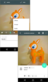 最後に、一番右のメニューボタンをタップすると、公開範囲の設定ができます。アプリ内に写真を保存する[Offline]、自分だけが見られる状態でアップロードする[Private]、アップロードして公開する[Public]の3種類があります。[Private]と[Public]を選択するには、「Seene」のアカウントを作成する必要があります。
