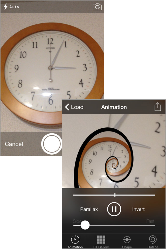 カメラボタンをタップすると、カメラが起動するので、シャッターボタンをタップして撮影しましょう。撮影した画像は、[Animation]画面に表示され、動きのあるアニメーションに変換されます。今回は時計の写真を撮影してみたところ、ぐるぐると渦を巻くように奥に吸い込まれていくアニメーションができました。ずっと見ているとくらくらしてしまいますね!
