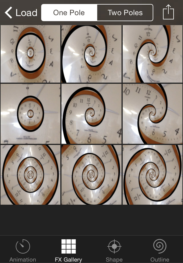 次に、画面下部の[FX Gallery]をタップすると、9種類の効果の一覧が表示されます。特に効果名は見当たりませんでしたが、繰り返しの円、右巻きの渦巻き、右巻き左巻きの渦などがあります。画面上部の[One Pole]では渦が1つ、[Two Poles]をタップすると渦が2つになります。