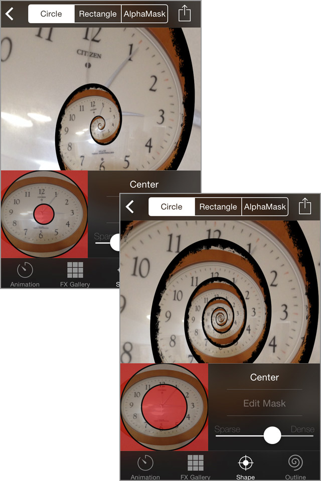 画面上部の[Circle]をタップすると渦巻き/円形に、[Rectangle]をタップすると長方形に、[AlphaMask]をタップすると塗りつぶした形に、繰り返しの形を変えることができます。