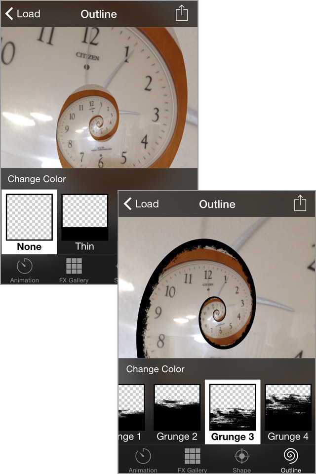 [Shape]や[Outline]を調整したら、もう一度[Animation][FX Gallery]を確認してみると、また違った動きになっていてとてもおもしろいので、納得の行く画像になるまで何度も調整を繰り返すことをオススメします。気に入った画像ができたら、画面右上の保存ボタンをタップしてください。