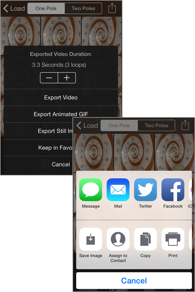 保存する画像の設定画面が表示されます。保存方法は、[Export Video(動画で保存)][Export Animated GIF(GIFアニメーションで保存)][Export Still Image(画像で保存)][Keep in Favorites(アプリ内のお気に入りに保存)]から選ぶことができます。動画で保存したいときは、画面上部の[Exported Video Duration]で、繰り返しの秒数(回数)を調整しましょう。